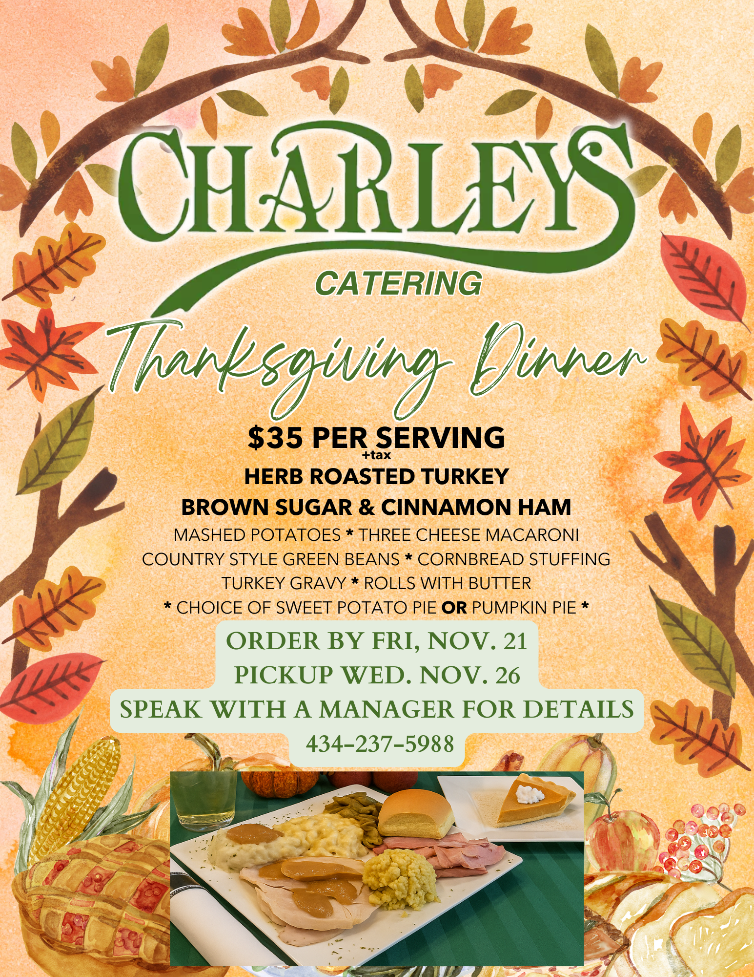 Thanksgiving is centered around gathering with loved ones and sharing great food. Charley's understands the significance of a hearty Thanksgiving meal. Let us help by providing "Ready To Heat & Eat" meals that are sure to please every palate.